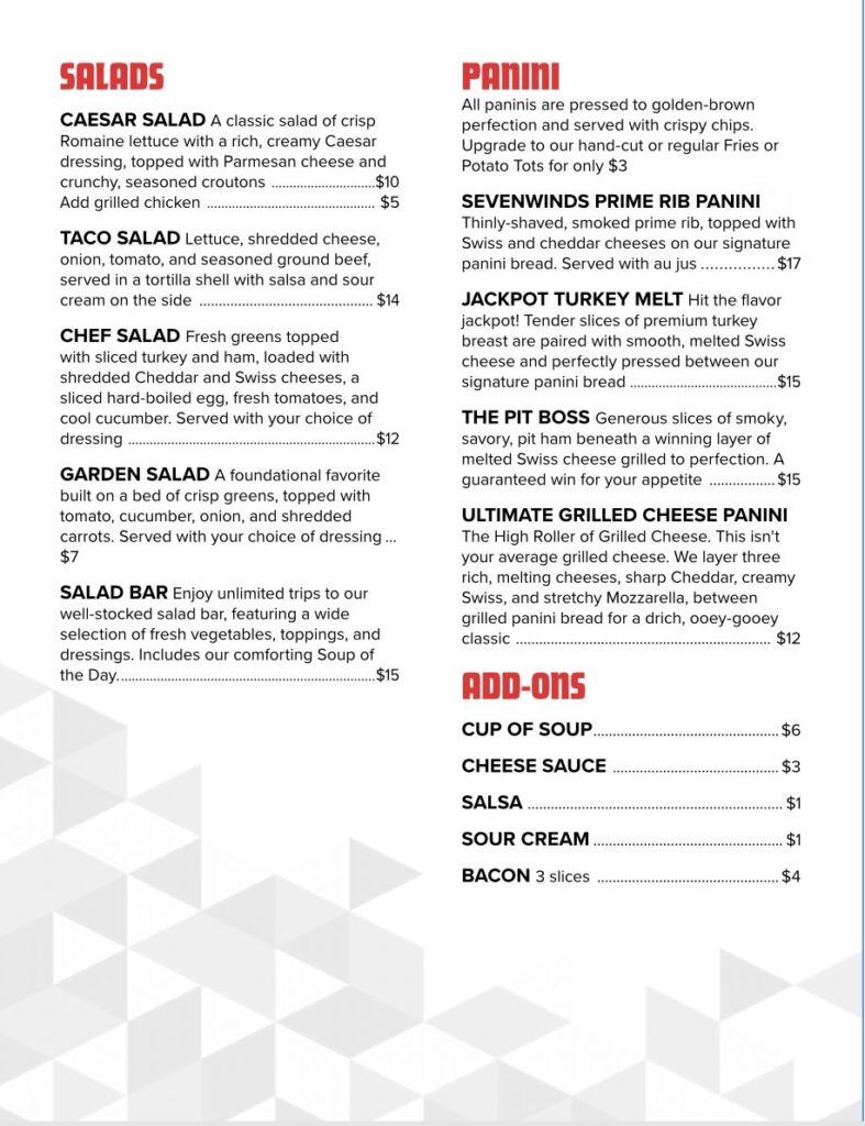 ALL-YOU-CAN-EAT buffet featuring Baked Chicken and Baked Cod, Grilled Chicken in Mushroom Sauce, Salad Bar, Soup of the Day, Shrimp Cocktail, Rolls with Butter, Beef Stroganoff, Butter Noodles, Mashed Potatoes, Gravy, and Vegetables and a rotating Chef’s Choice. Finish with Warm Fruit Crumble and select desserts. Dinner served after 3 PM, including Carved Prime Rib, Shrimp Scampi, and Fried Cod. Beverages included.