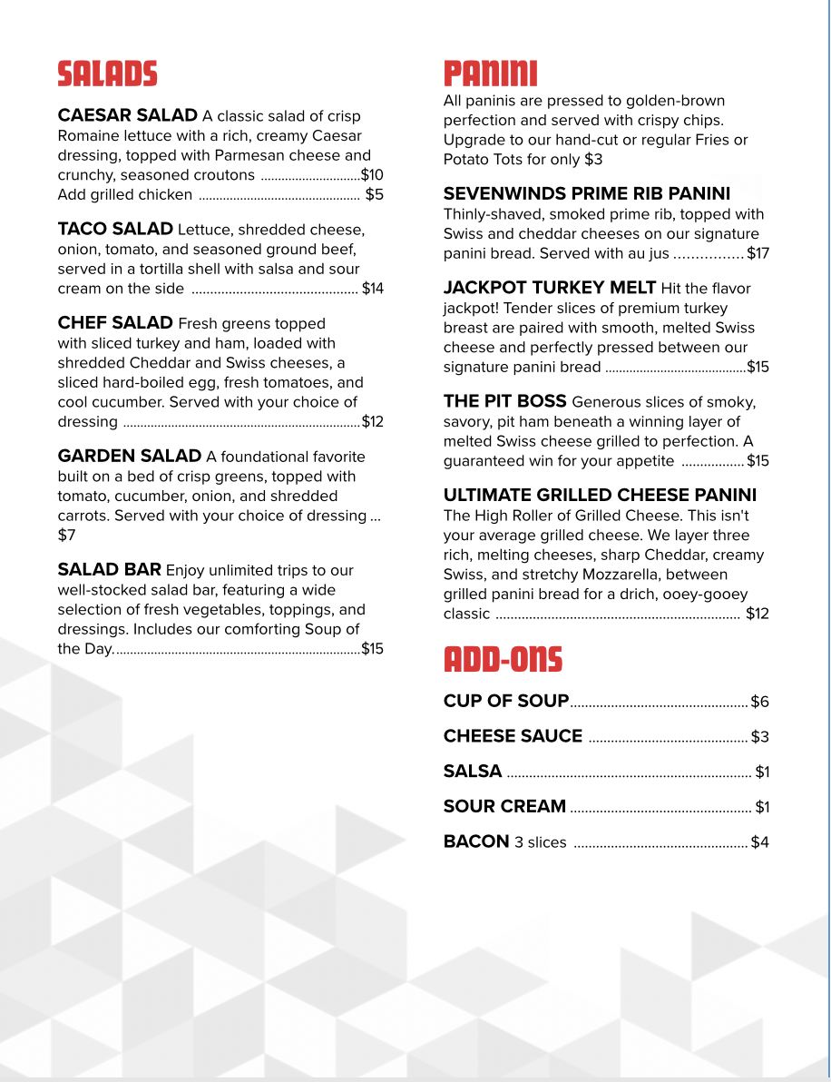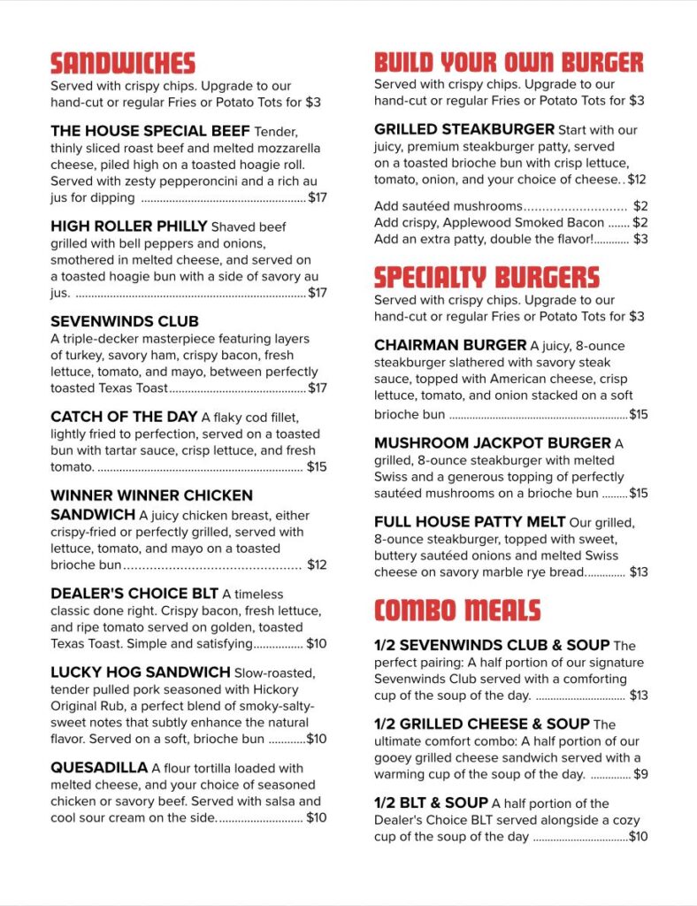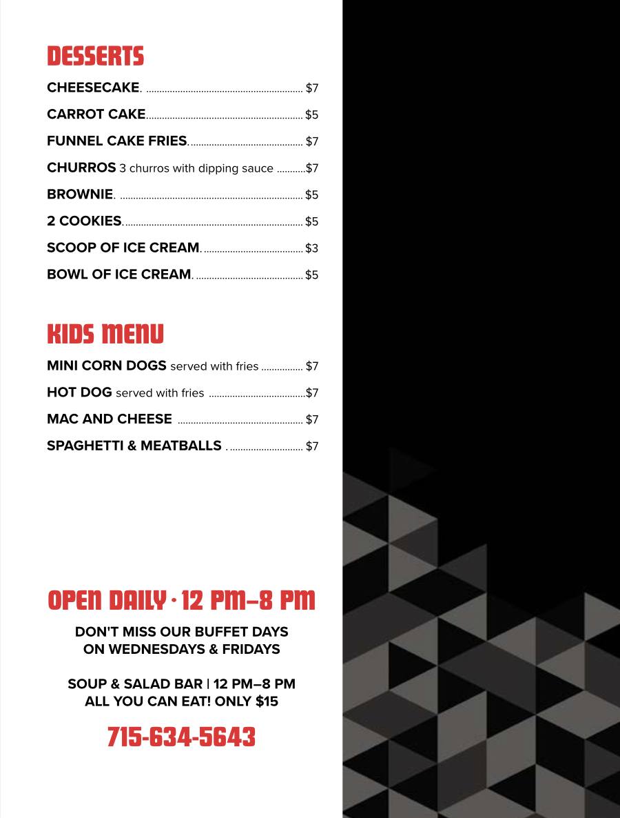 ALL-YOU-CAN-EAT buffet featuring favorites like BBQ Ribs, BBQ Chicken, Salad Bar, Soup of the Day, Shrimp Cocktail, Rolls with Butter, Sausage & Peppers, Mac & Cheese, Baked Beans, Mashed Potatoes, Gravy, Two Vegetables and a rotating Chef’s Choice. Finish with Warm Fruit Crumble and select desserts. Dinner served after 3 PM, including Carved Brisket, Shrimp Scampi, and Fried Cod. Beverages included.